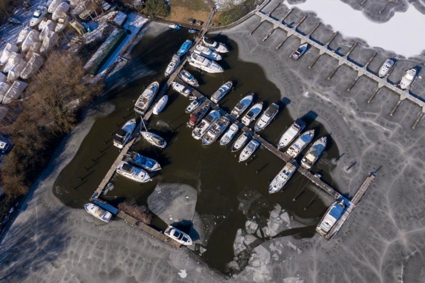 Winter 2020/21 im Heimat-Hafen Luftaufnahmen von Ralph Loop Eine Luft-Sprudel-Anlage hält die Bootsrümpfe auch bei minus 13 Grad Celsius eisfrei...